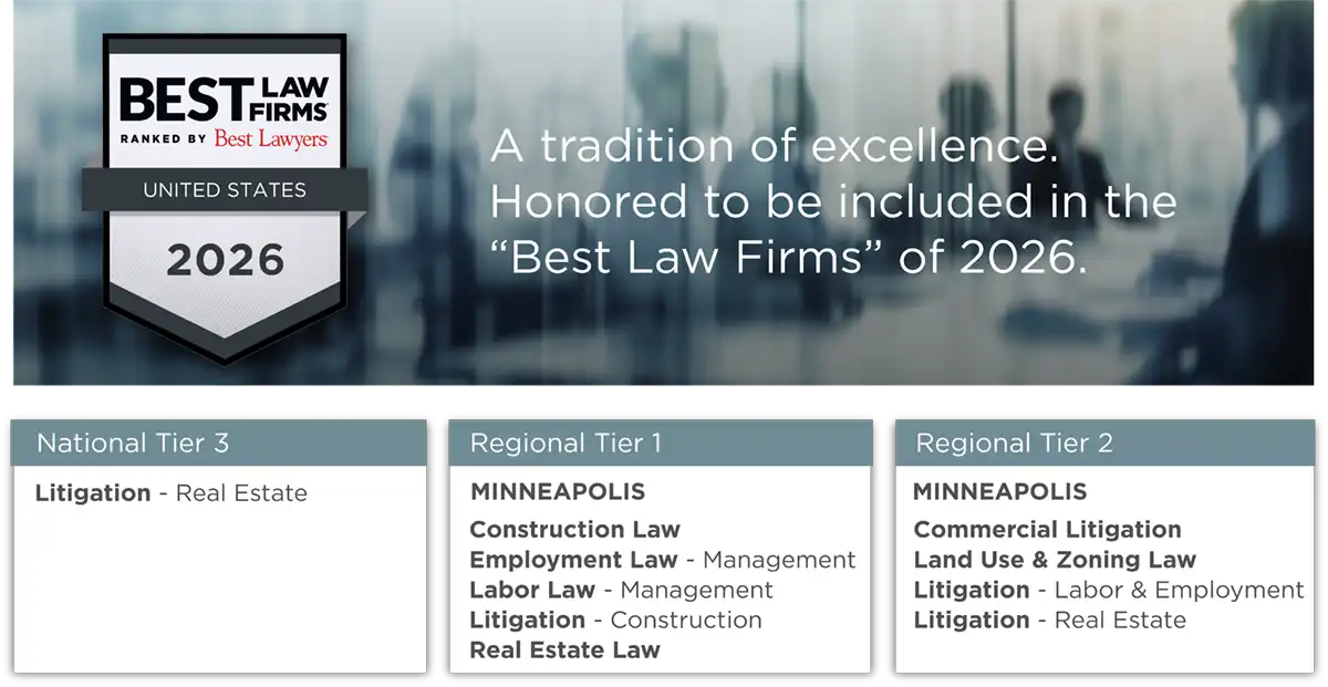 We are proud to announce that the firm has once again been recognized among the nation’s top law firms—and as one of the leading firms in the Minneapolis metropolitan region—by U.S. News – Best Lawyers® in its 2026 “Best Law Firms” rankings.